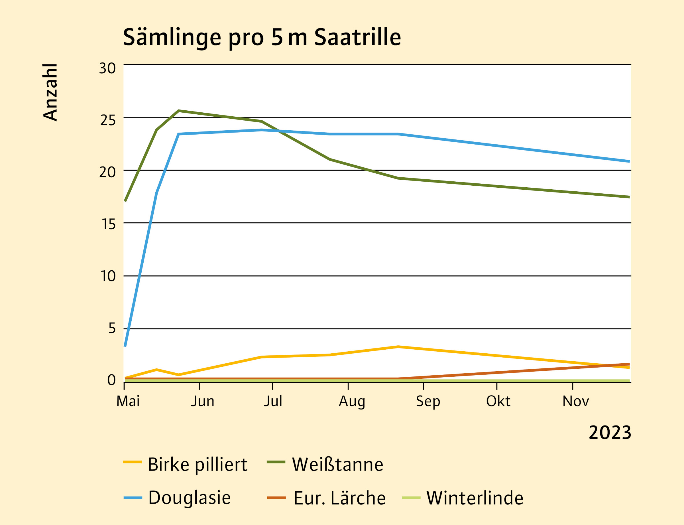 Bereits Anfang Mai 2023 keimten zahlreiche gesäte Tannen, gefolgt von Douglasien und einigen Lärchen. Erste Birken kamen im Sommer dazu. Erwartungsgemäß keimte die Linde noch nicht, dies wird für das Frühjahr 2024 erwartet. Die mehrfache Auszählung der Saatrinnen zeigte im Sommer 2023 ca. 10 Keimlinge pro Laufmeter. Dies entspricht mit rechnerisch 18.000 Stück pro Hektar etwa dem Zehnfachen einer Pflanzkultur und liegt weit über den erwarteten Endbaumzahlen. Abbildung 4 zeigt die vorläufigen Auflaufzahlen für die fünf Baumarten auf den BiMiSa-Flächen bis Ende November 2023.