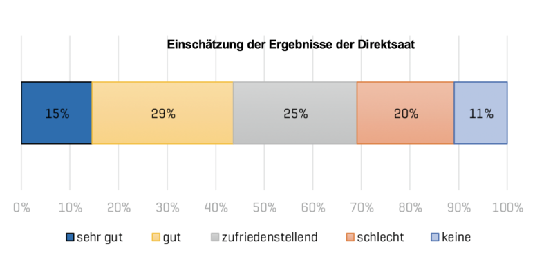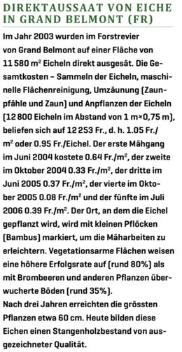 Allerdings ist auch die Direktsaat nicht gegen Fehlschläge gefeit. Die Studie führt die Misserfolge auf folgende Ursachen zurück: für die Baumarten ungeeignete Standortwahl, für die Keimung ungünstige Witterungsverhältnisse bei der Aussaat (Trockenheit, Nässe und folglich Saatgutkrankheiten, Frost), fehlerhafte Aussaatmethoden (kein Kontakt mit Mineralboden, Saat, zu tief oder nicht genug übererdet usw.), üppige Grasvegetation, starke Konkurrenz durch Begleitbaumarten oder auch Tierfrass (Eicheln). Trotz diesen Schwierigkeiten kann die Direktsaat eine sinnvolle, kostengünstige Ergänzung oder eine geeignete Alternative zur Pflanzung darstellen.
