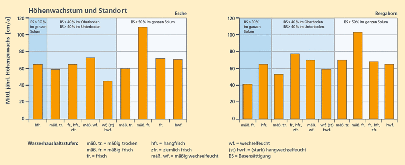 Neben der Nährstoffversorgung ist der Wasserhaushalt sowohl für die Kulturen als auch das weitere Wachstum wichtig. Ein sehr gutes Wachstum (Trieblängen von 60 bis 100 cm pro Jahr) erzielten die Eschen und Bergahorne auf mäßig frischen bis feuchten sowie mäßig wechselfeuchten Standorten (Abb. 2, vgl. Kästen Basensättigung und Wasserhaushaltsstufen).
