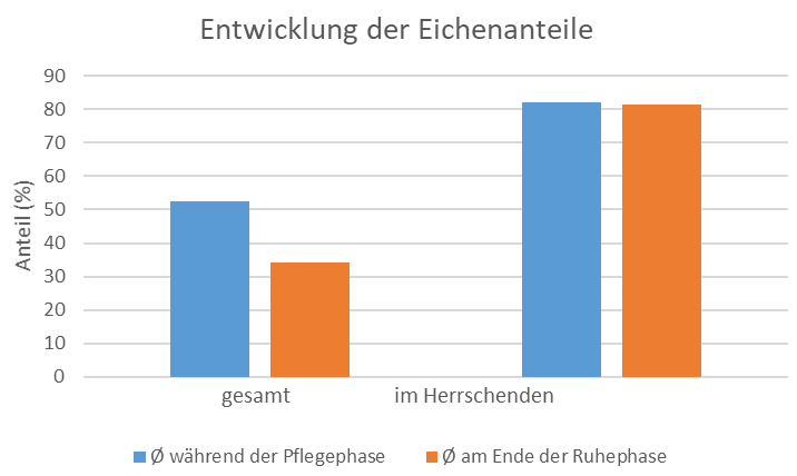 Vergleicht man die Baumartenanteile zwischen der Pflegephase und dem Ende der Ruhephase, so ist ein deutlicher Trend erkennbar (Abb. 3): Der Anteil der Eichen, gemessen an der gesamten Bestockung, nimmt um 18 % ab, sodass am Ende der Ruhephase nur noch 34 % der Fläche von Eichen bestockt werden. Im Herrschenden ist dieser Trend jedoch nicht vorhanden: Dort fand lediglich eine unbedeutende Abnahme um 1 % statt, sodass der Eichenanteil immer noch über 80 % liegt. Es ist davon auszugehen, dass der Eiche während der Pflegephase durch das Entfernen der Konkurrenzvegetation ein Wachstumsvorsprung verschafft wurde, den die Hainbuche als Hauptkonkurrentin in der Ruhephase nicht mehr einholen kann. Positiv wirkt sich dies auf die Schaftreinigung aus, welche durch die zahlenmäßig überlegenen Hainbuchen unter der herrschenden Eichenschicht beschleunigt wird. Die Grundlagen für eine erfolgreiche Eichen-Wertholzproduktion sind hiermit gelegt und der langfristige Erhalt der natürlich verjüngten Eichen erscheint weitgehend gesichert.