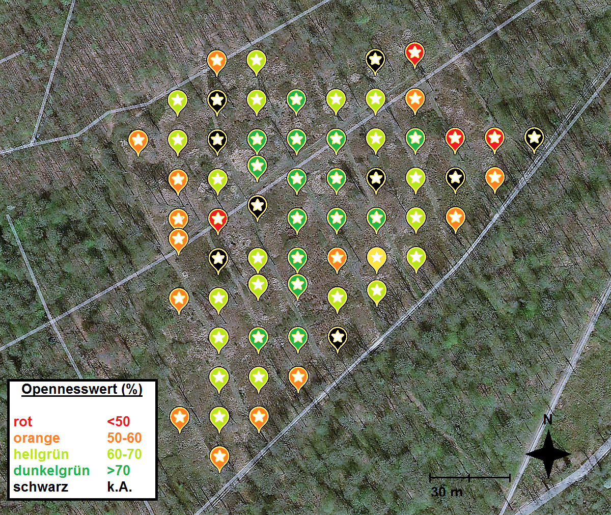 Aus den Opennesswerten der hemisphärischen Fotos und der Verteilung des Lichteinfalls (Abb. 4 & 5) wird augenscheinlich, dass die Lichtverfügbarkeit vom Rand der 6 ha umfassenden Verjüngungsfläche bis zu ihrem Zentrum mit einer nur geringen Variabilität hin zunimmt. Die Trieblängen an ausgewählten Stichprobenpunkten, bestehend aus Frühjahrstrieb und Johannistrieb, dokumentieren für die letzten zwei Vegetationsperioden diesen Lichteinfluss. Bei Opennesswerten über 60 % (Abb. 6) waren die Johannistriebe durchschnittlich eineinhalbmal so lang wie bei Opennesswerten unter 60 % (Tab. 1). Das Wachstum und die Überlegenheit der Eichen gegenüber der Hainbuche werden ganz besonders durch den Johannistrieb gefördert. Erst durch diesen Vorteil und in Kombination mit der intensiven Pflege ist es möglich, 105.000 vitale Eichen/ha in die Ruhephase zu entlassen. Um die Stabilität der Eichen im Herrschenden zu untersuchen, wurde zudem je nach Alter der Probeflächen der Wurzelhalsdurchmesser bzw. BHD gemessen. Die Werte entsprechen jeweils den Vorstellungen bei gepflanzten Eichenbeständen und belegen, dass die aus dem Verjüngungsverfahren hervorgegangenen Eichen weder zu dünn noch zu protzig sind und als stabil bezeichnet werden können.