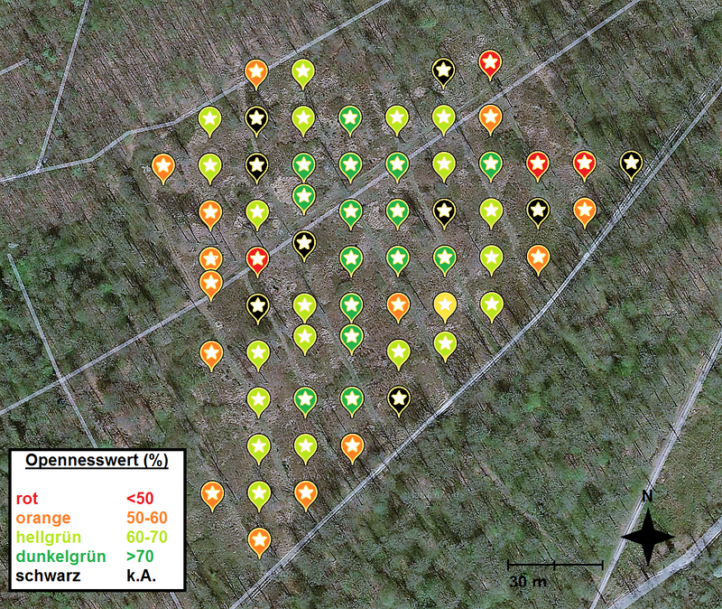 Daher soll das in dieser Region aus der waldbaulichen Tradition heraus wiederbelebte und seit nun 15 Jahren erprobte Verjüngungsverfahren des Großschirmschlags waldbaulich und bezüglich der Kosten des neuen Eichenjungbestandes dokumentiert und überprüft werden. Dabei wurden anhand von 90 systematisch verteilten Stichprobenpunkten (r = 1 m bzw. 3 m) auf 4 Verjüngungsflächen, die das Stadium der Ansamung, der Pflegephase und das Ende der Ruhephase widerspiegeln, Messungen zu Baumartenanteilen, zum Alter der aufwachsenden Baumarten, der Öffnung des Kronendaches anhand hemisphärischer Fotos und der Baumhöhe und der Längen von Frühjahrs- und Johannistrieben durchgeführt. Auch die Kosten dieses Verjüngungsverfahrens, ohne jedoch Hiebsreifeverluste einzelner noch nicht ausgereifter Alteichen, wurden aus den betrieblichen Unterlagen entnommen und bewertet.