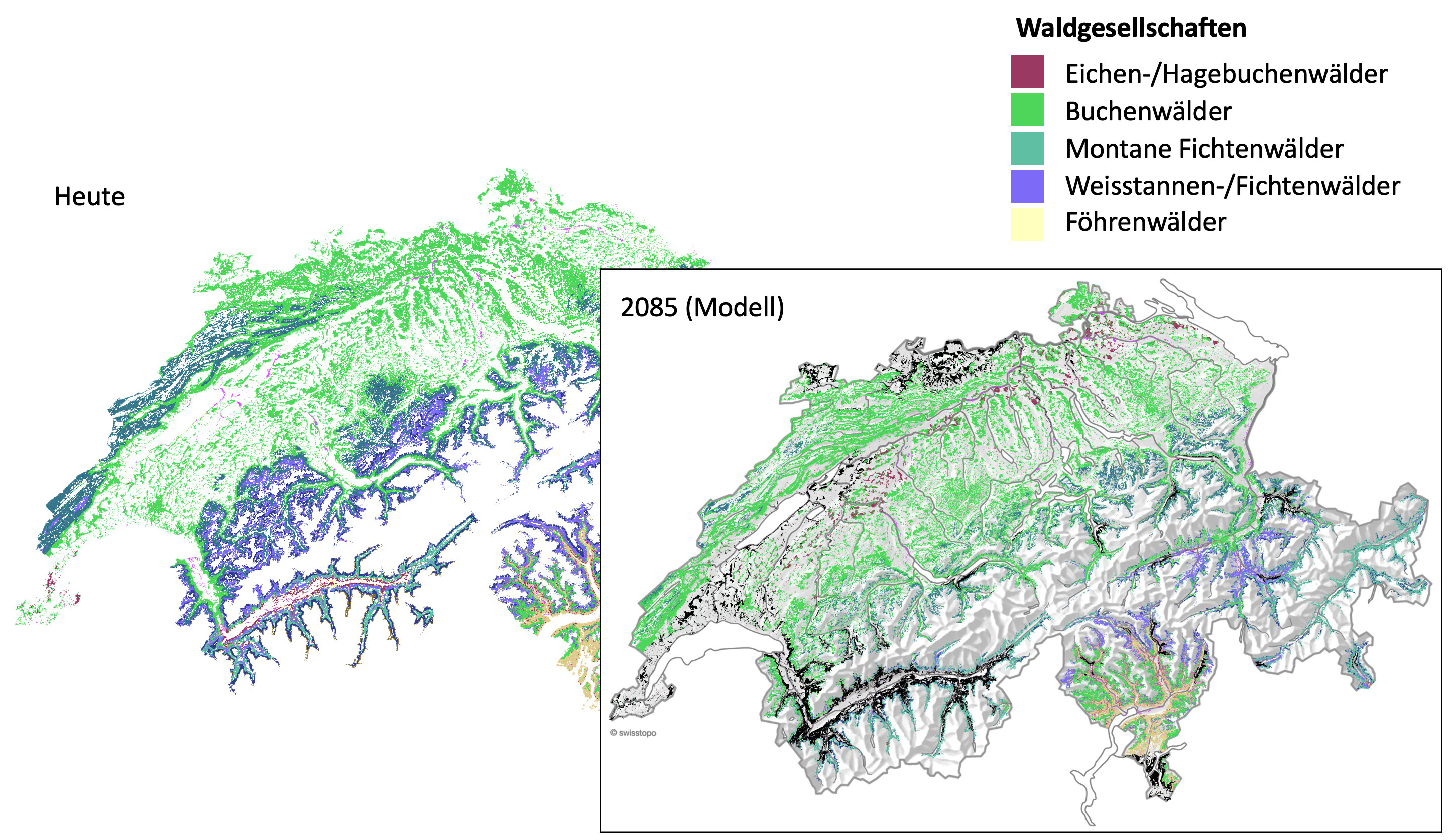 Mit Modellen kann die potenziell natürliche Baumartenzusammensetzung einer Waldfläche unter heutigen und künftigen Klimabedingungen berechnet werden (Abb. 2).