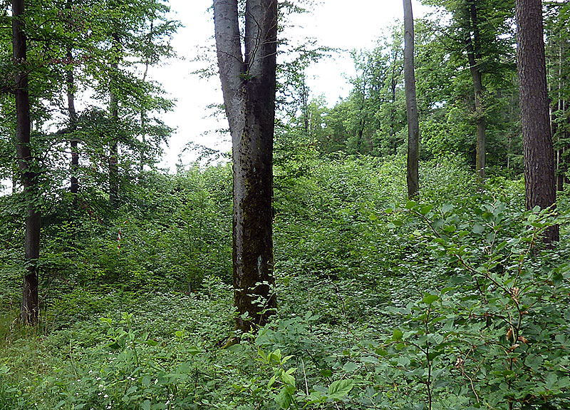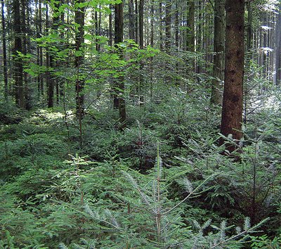 Abb. 1: Eine gelungene Mischverjüngung aus Fichte, Tanne, Ahorn und Buche untern einem von Fichten dominierten Altbestand im Stadtwald von Burgau/Schwaben. Ein angepasster Wildbestand ermöglichte hier das Aufkommen einer zukunftsträchtigen Baumartenmischung aus reiner Naturverjüngung (Foto: W. Rothkegel).