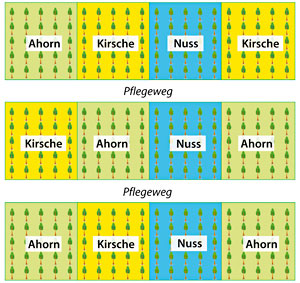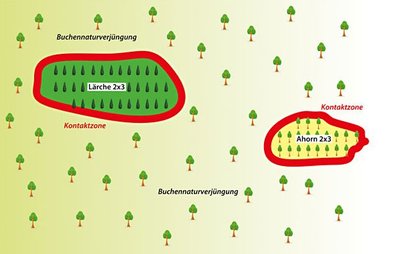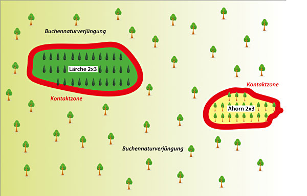 Wesentlich bei der Anlage von Mischbeständen ist daher eine klare Planung bezüglich der Aufgabe der einzelnen Baumart und die Wahl der entsprechenden Mischungsform, da diese von entscheidender Bedeutung ist für den waldbaulichen Erfolg und den Pflegeaufwand.