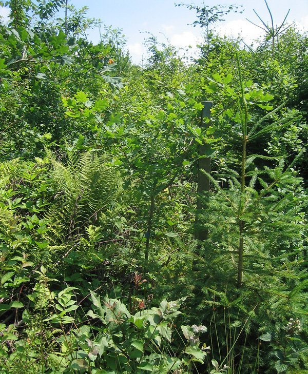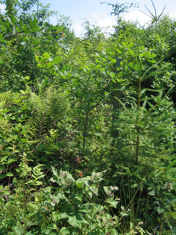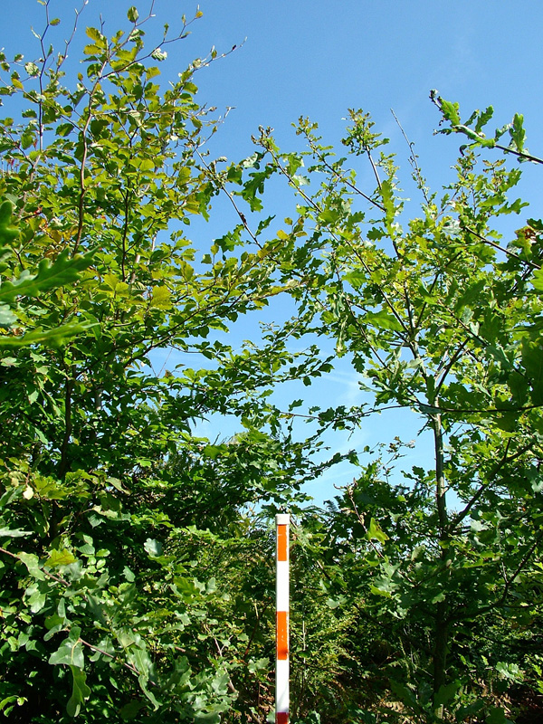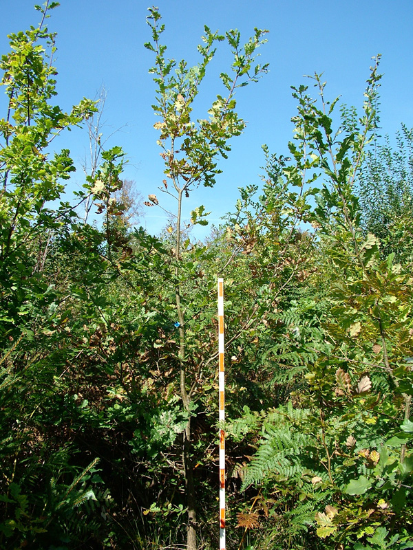 Wissenschaftler der Forschungsanstalt WSL haben die Reaktion von Eichen im Dickungsstadium auf Buchenkonkurrenz untersucht. Dazu wählten Sie auf zwei jeweils 1,8 ha grossen Versuchsflächen, die in Lothar-Sturmflächen bei Habsburg (Kanton Aargau) und Murten (Kanton Freiburg) liegen, je 80 Eichen mit unterschiedlich starker Konkurrenz durch benachbarte Buchen aus. Die Entwicklung der gepflanzten Eichen und der Buchen-Naturverjüngung war aus Stichprobeninventuren bekannt, die in unterschiedlicher Intensität in den Jahren 2001, 2002, 2003 und 2004 stattgefunden hatten. Im Jahr 2007 wurde dann die Konkurrenzsituation erfasst. Mit dem Studie quantifizierten die Forscher insbesondere Konkurrenzwirkungen auf Höhen- und Dickenwachstum, Stabilität und Astigkeit der Stämmchen.