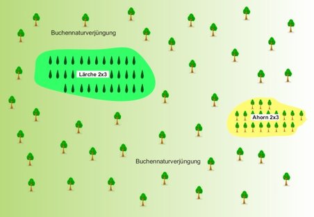 Dieses Prinzip der Mischbestandesbegründung durch Reinbestandeszellen kann sowohl bei der künstlichen Begründung auf der Freifläche (Abbildung 3), bei der Ergänzung von Lücken in Naturverjüngungen (z.B. Einbringung von Lärchen- oder Edellaubholztrupps in einen Grundbestand aus Buchen-Naturverjüngung; Abbildung 4) oder bei der Mischungsregulierung von reinen Naturverjüngungsflächen zur Anwendung gelangen.