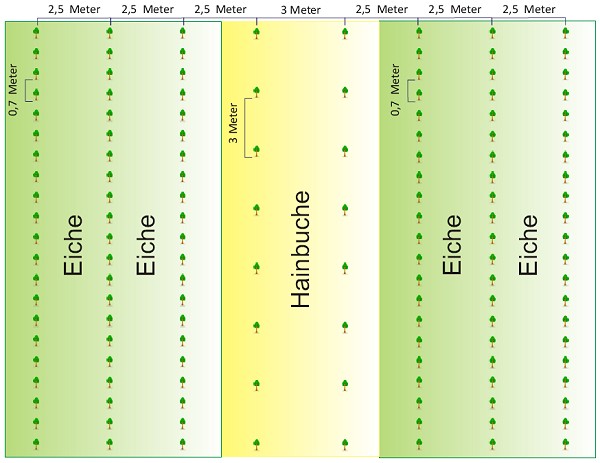 Abbildung 2: Zweckmäßiger 3:2-Reihenverband; die Streifen (3 Reihen) der Hauptbaumart Eiche befinden sich bereits in durchschnittlicher Endbestandsentfernung; dienender Nebenbestand (2 Reihen) aus Hainbuche.