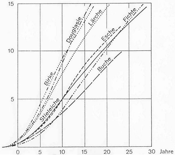Probleme bei der Erziehung von Mischbeständen ergeben sich vor allem durch die unterschiedliche Höhenwuchsdynamik (Abbildung 1), spezifische Lichtansprüche, unterschiedliche Lebensdauer und Baumhöhe und unterschiedliches Reaktionsvermögen der Baumkronen der zu mischenden Baumarten. Dadurch scheiden konkurrenzbedingt in vielen Mischbeständen Baumarten bereits in relativ jungen Alterphasen wieder aus.