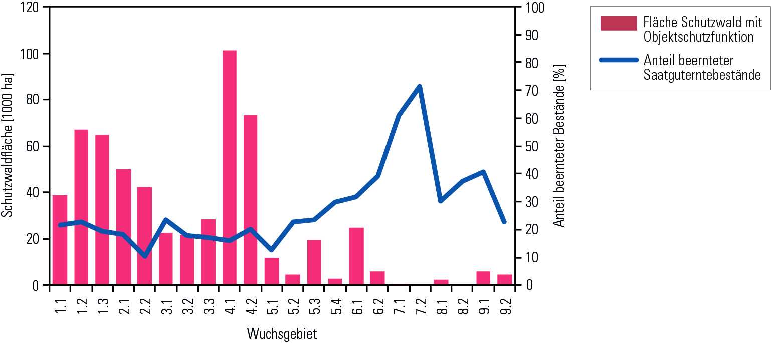 Abb. 3: Vergleich der Schutzwaldfläche mit Objektschutzfunktion mit dem Anteil der beernteten Saatguterntebestände nach Wuchsgebieten. Der Anteil der beernteten Saatguterntebestände ergibt sich aus der Gesamtzahl zugelassener Bestände und den zwischen 1997 und 2021 durchgeführten