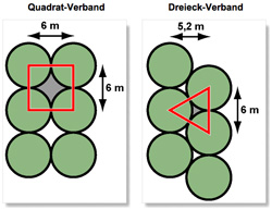Ein Dreieck- bzw. Rechteckverband ist hinsichtlich der Raumausnutzung stets effizienter als ein Quadratverband, weil dadurch die Lücken minimiert werden. Je nach den örtlichen Gegebenheiten und betrieblichen Notwendigkeiten sind bei Fichte Pflanzenzahlen zwischen 2500 und 1200 pro Hektar ausreichend.