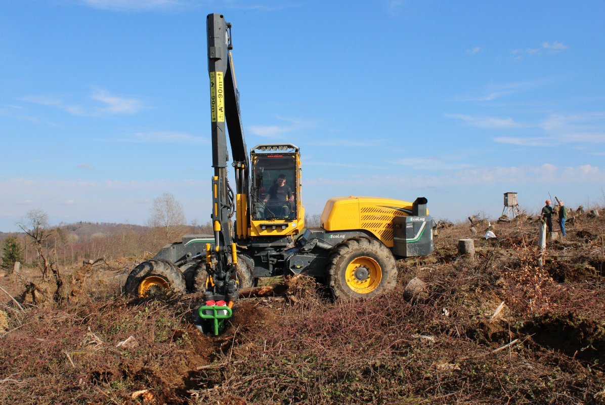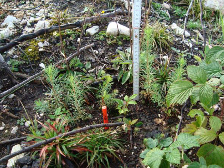 Die Schadfläche befindet sich auf einem Plateau im Lattengebirge auf ca. 1.400 m ü. NN. Das Ausgangsgestein besteht aus Dachsteinkalk, der von flachgründigem Mineralboden oder Tangelhumus überdeckt wird. Hier wurden auf 5 ha mit leichter Südwestexposition Versuchsparzellen mit einer Größe von 20 x 20 m angelegt. Auf insgesamt 16 dieser Parzellen wurden im Frühjahr 2008 die Baumarten Fichte, Lärche und Grauerle mittels Saat ausgebracht. Davon wurde auf jeweils vier Parzellen reine Fichte, Lärche und Grauerle und auf weiteren vier Parzellen eine Mischung aus diesen drei Baumarten gesät. Verwendet wurde zertifiziertes Hochlagensaatgut vom Pflanzgartenstützpunkt Laufen. Für die Ausbringung wurde an 70–90 Saatplätzen pro Parzelle die Bodenvegetation auf einem 40 x 40 cm Quadrat mit einer Wiedehopfhaue komplett entfernt (Abbildung 2). Neben den Saat-Varianten befinden sich auf weiteren Parzellen verschiedenste Varianten zur Wiederbewaldung, darunter die Pflanzung von Laub- und Nadelhölzern, ein Hydrosaatversuch und Flächen zur Beobachtung der Naturverjüngung.