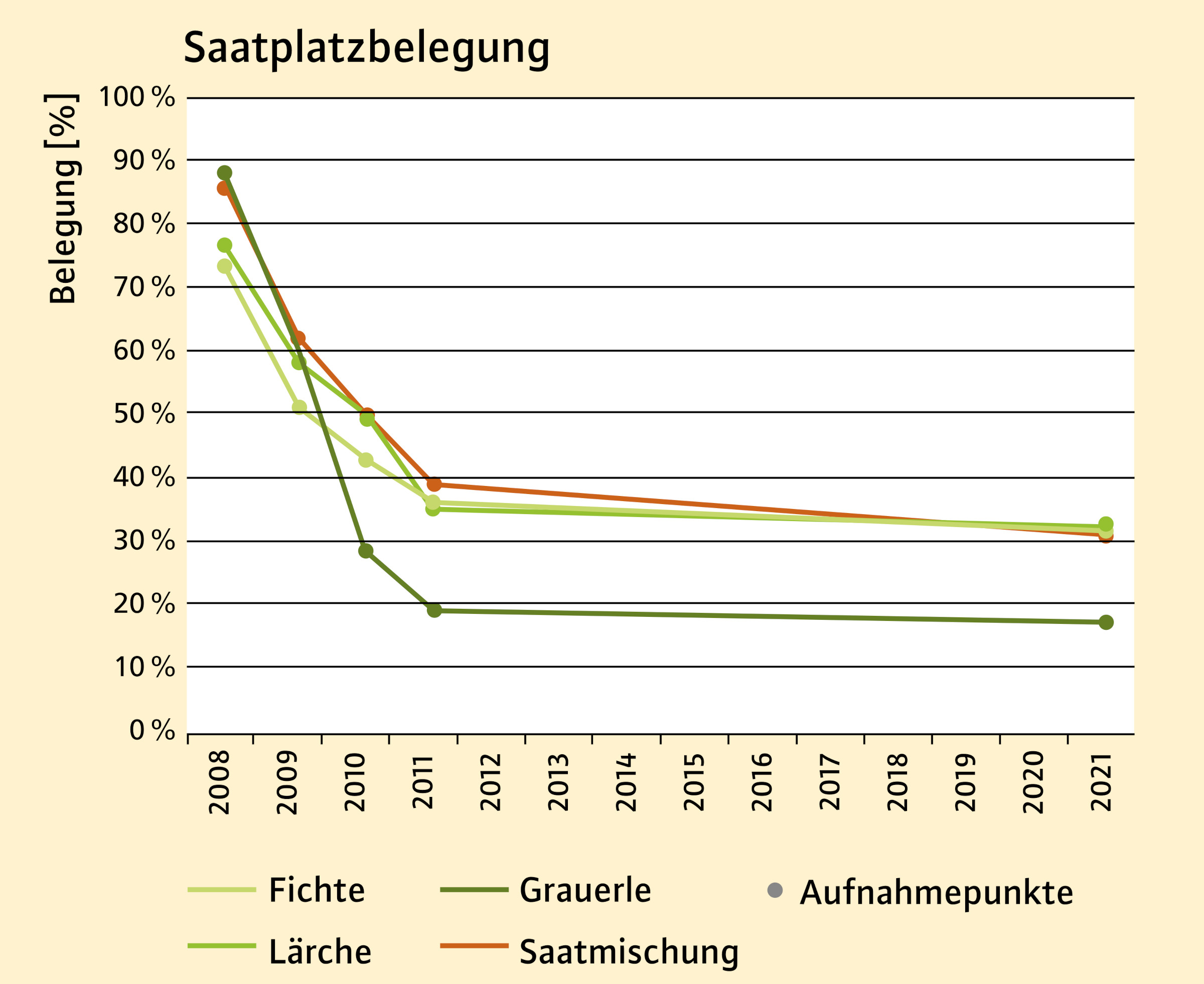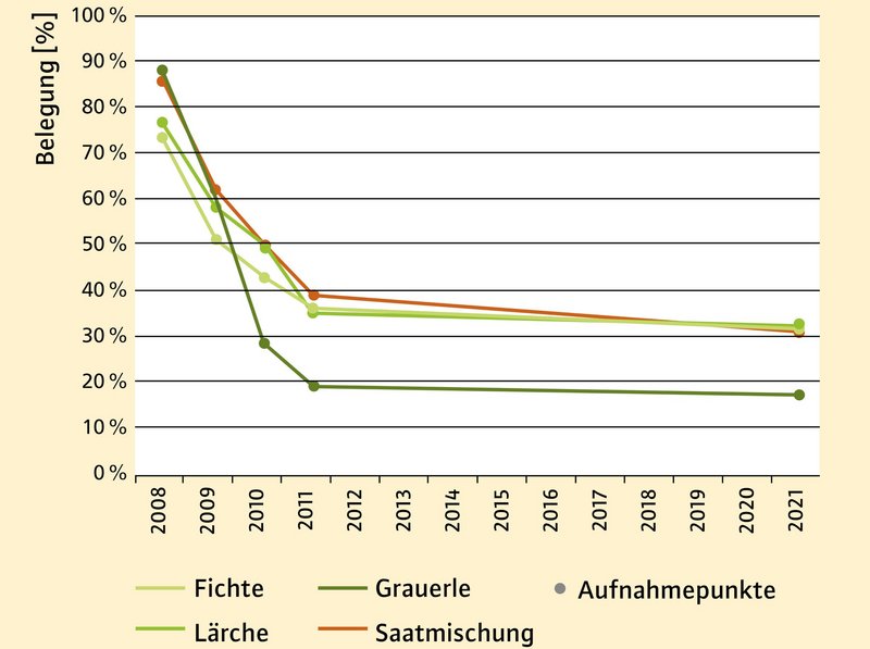 Abbildung 3 zeigt die Saatplatzbelegung von 2008 bis 2021. Hier fällt auf, dass besonders in den ersten beiden Jahren hohe Ausfälle zu verzeichnen waren. So waren 2010 von allen gesäten Baumarten gerade noch die Hälfte der Saatplätze belegt – in zwei Fällen sogar deutlich weniger (Fichte 43 %; Grauerle 29 %). Auch im Jahr 2011 war nochmals eine deutliche Reduktion der belegten Saatplätze zu verzeichnen. In den Folgejahren fanden bis 2021 keine Aufnahmen mehr statt. 2021 wurden auf ca. 1/3 der Saatplätze von Lärche, Fichte und Saatmischung mindestens ein lebendes Individuum gefunden. Von der Grauerle waren über 80 % der Saatplätze nicht mehr belegt.