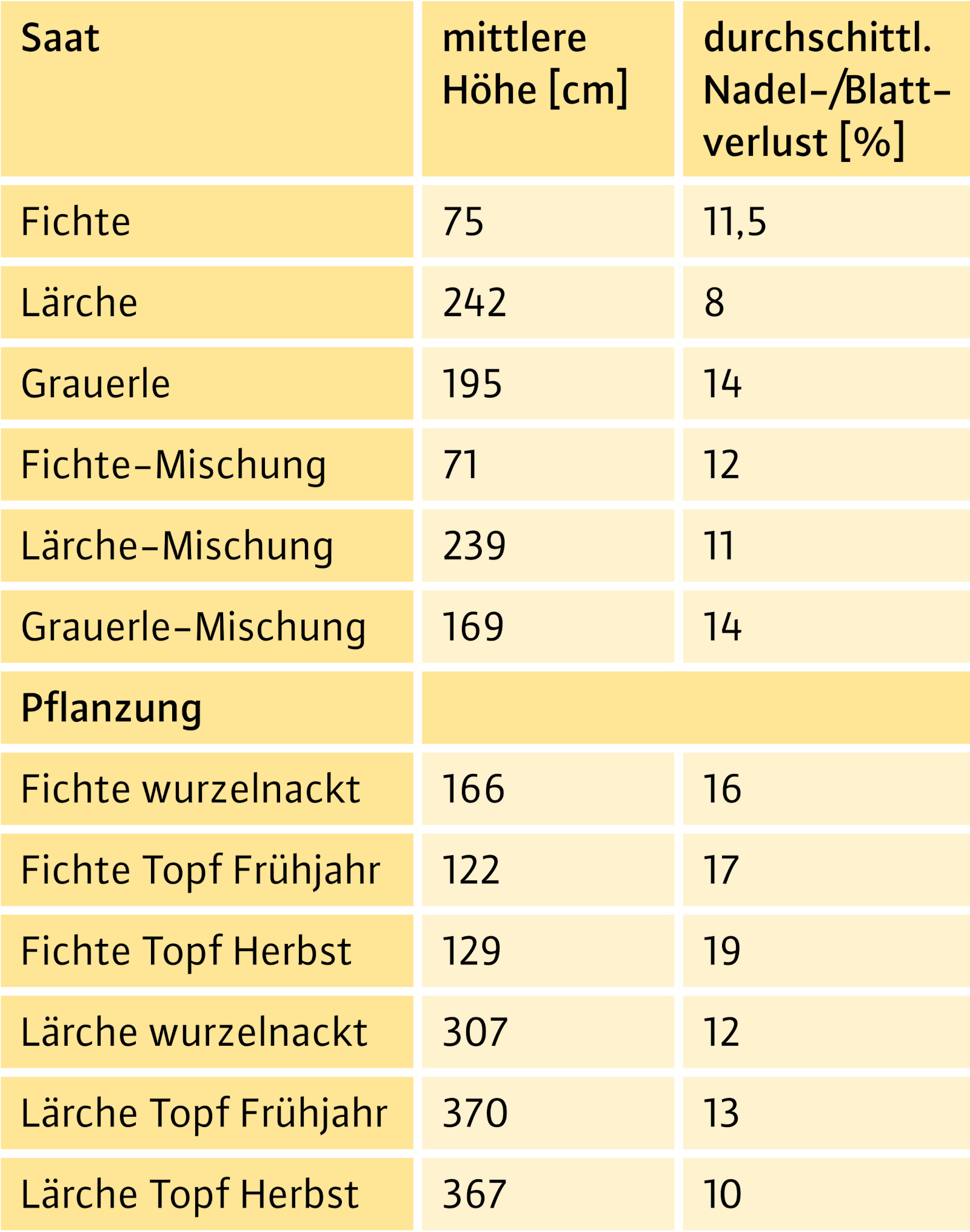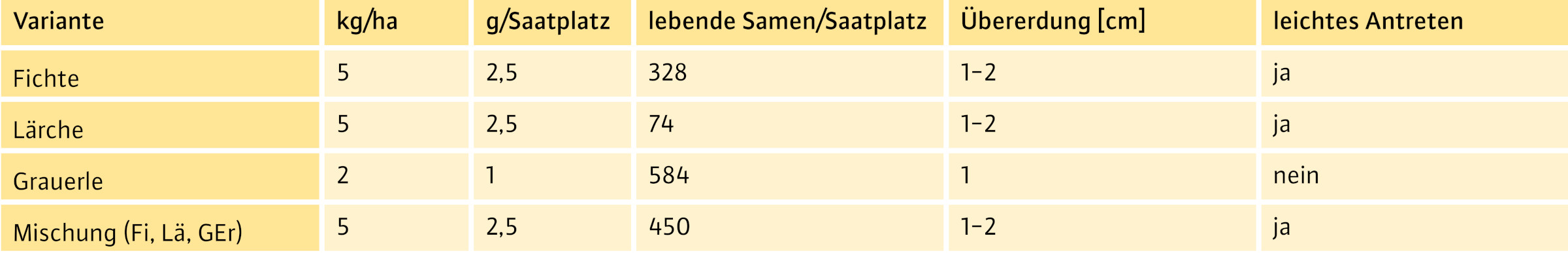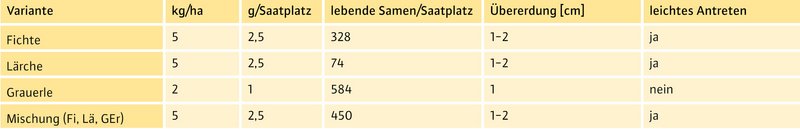 Die Ergebnisse stellen eine Zusammenfassung der 16 Saat-Parzellen dar, wobei die Ausfallraten bei der Fichte und der Saatmischung über alle Parzellen ähnlich hoch waren. Auf den Parzellen, die mit Grauerle und Lärche belegt sind, schwanken die Überlebensraten deutlich (überlebende Bäume pro Parzelle: Grauerle 3–35, Lärche 17–43). Nach Ablauf der ersten drei Jahre ist bis zur letzten Aufnahme nur ein geringer Teil der Saatplätze verschwunden. Hier zeigt sich, dass für den Saaterfolg die ersten Jahre entscheidend waren und nach Etablierung die Überlebenschancen der jungen Bäume deutlich höher waren.