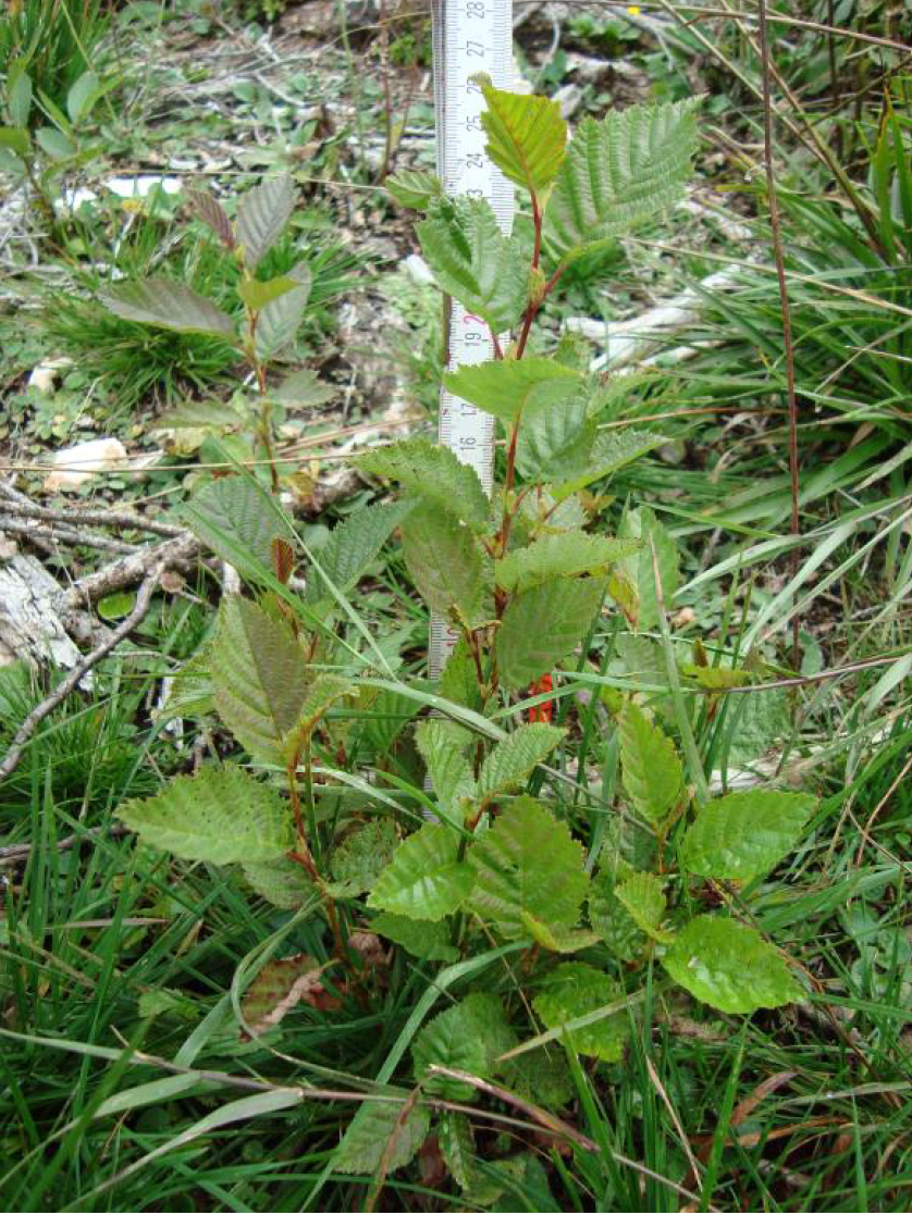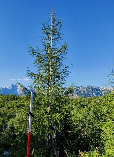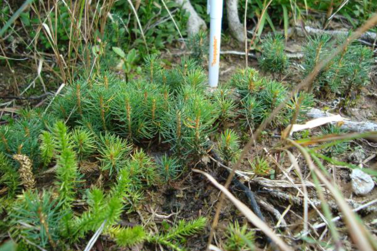 Insgesamt hat die Saat hinsichtlich der Wiederbestockung der Freifläche kein befriedigendes Ergebnis hervorgebracht. Besonders die Laubbaumart Grauerle, die eigentlich natürlicherweise im Hochgebirge zu finden ist, hatte nur einen sehr geringen Anwuchserfolg. Bei der gemischten Saat haben sich auf den Saatplätzen überwiegend die Fichte und die Lärche durchgesetzt. Auf den 2021 noch vorhandenen Saatplätzen der gemischten Variante wurden 41 % der Plätze von Fichte und 36 % von der Lärche dominiert. Dagegen kam die Grauerle nur noch auf 23 % der Plätze vor.