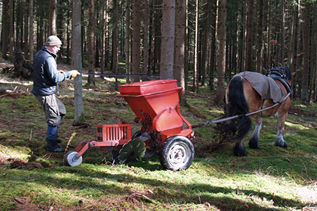Vereinzelt berichteten uns Förster von kleinen Versuchen, bei denen sie eigenhändig die Saat ausgebracht hatten, insbesondere mit Walnüssen und Eicheln. Die Erfahrungen sind etwas widersprüchlich und leider nicht durch systematische Versuche belegt. Bis heute hat sich diese einfache Handsaat im Wald nicht durchgesetzt.