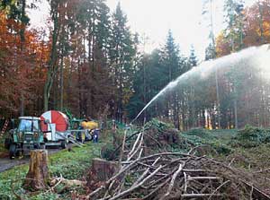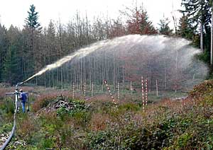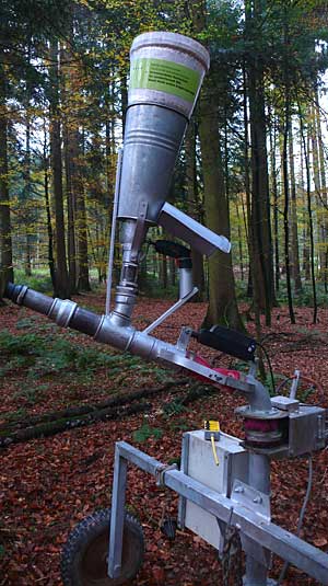 An der SHL Zollikofen wurde in einem Forschungsprojekt das Ziel verfolgt, mit gewöhnlichen Landwirtschaftsmaschinen rationell und ohne Bodenbearbeitung zu sähen und so die Naturverjüngung zu ergänzen. Getüftelt wurde mit gängigen Geräten wie Güllefässern, Druckpumpen und fahrendem Schlauchhaspel. Die Grundidee war dabei immer dieselbe: Das Saatgut wird ab Waldstrasse oder Rückegasse mittels Wasserwerfern in die Schlagflächen gespickt. Nach anderthalb Jahren Entwicklung und verschiedensten Versuchen mit technischen Verbesserungen steht nun fest: Die Aussaat im Wald mittels Wasserwerfern ist technisch machbar. Die Gerätschaft lässt sich problemlos durch die vorhandenen Rückegassen ziehen und das Saatgut wird in genügender Dichte ausgebracht. Innert weniger Minuten lassen sich durch diese Methode die Samen auf einer Breite von fünfzig bis sechzig Metern ausbringen. Erprobt wurde das Verfahren vorerst mit Kirschsteinen und Eicheln.