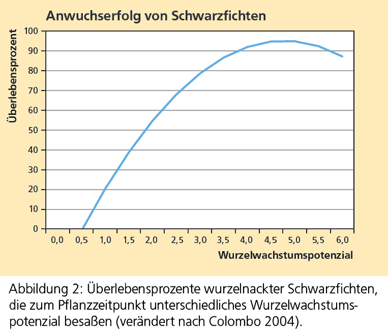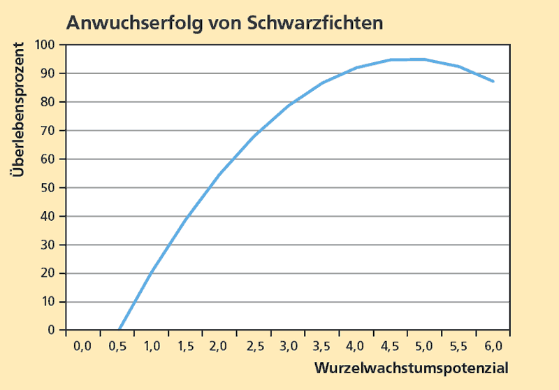 Wurzelvolumen und Wurzel-Spross-Verhältnis: Um den Anwuchserfolg zu sichern, ist es nötig, dass das Wurzelwachstum sofort nach der Pflanzung einsetzt. Frische Pflanzen mit größerem Wurzelvolumen können Wasser besser aufnehmen, den Pflanzschock leichter überstehen und haben bessere Anwuchschancen. Die optimale Forstpflanze sollte eine harmonisch ausbalancierte, funktionale Beziehung zwischen Spross und Wurzel aufweisen.