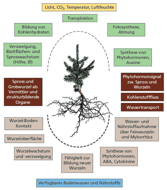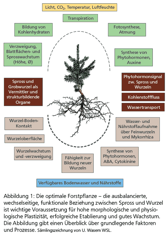 Abb. 1: Die optimale Forstpflanze - die ausbalancierte, wechselseitige, funktionale Beziehung zwischen Spross und Wurzel ist wichtige Voraussetzung für hohe morphologische und physiologische Plastizität, erfolgreiche Etablierung und gutes Wachstum. Die Abbildung gibt einen Überblick über grundlegende Faktoren und Prozesse (Sämlingszeichnung von U. Wasern, WSL).