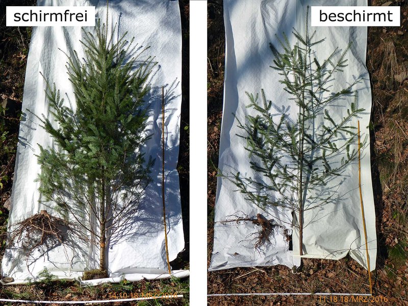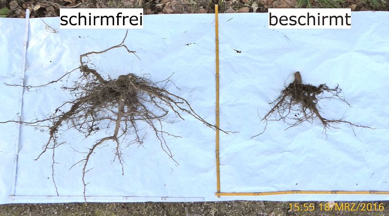 - Die Gewährleistung einer ausreichenden Wurzelentwicklung unter Schirm wachsender junger Douglasien ist auch deshalb wichtig, weil es momentan keine Hinweise darauf gibt, dass sich zuungunsten der Bewurzelung verschobene Spross-Wurzelverhältnisse nach Wegnahme des Schirms in überschaubarer Zeit (rd. 10 Jahre) wieder verbessern.