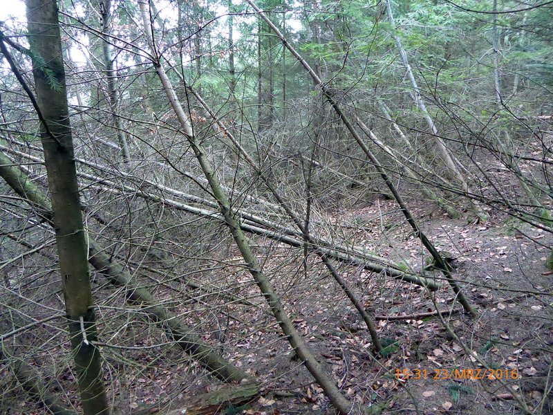 Abb. 2: Schneedruckschäden in unter Schirm aufwachsender, baumzahlreicher Douglasien-Naturverjüngung.