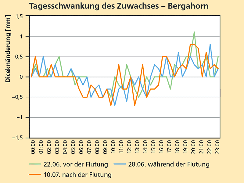 Beim Radialzuwachs zeigt sich bei keiner der Baumarten ein Unterschied zwischen den Zeitphasen vor, während oder nach der Überstauung (Abb. 6). Sie hat offenbar keinen Einfluss auf den Jahreszuwachs der Pflanzen. Zuwachseinbußen beim Dickenwachstum infolge von Überstauung zeigen sich nach zehn Tagen noch nicht.