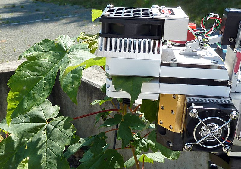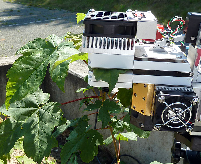 Während der Grundwasseranhebungen wurde kontinuierlich der Radialzuwachs an den Stämmchen der Pflanzen über Punktdendrometer erhoben. Zudem wurde an einzelnen Tagen die Nettophotosyntheserate an 24 Pflanzen pro Baumart mit einem Porometer (Abb. 2) gemessen. Beide Messwerte können die Reaktionen der Pflanzen auf Stress anzeigen.