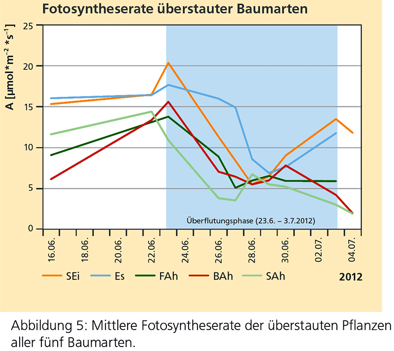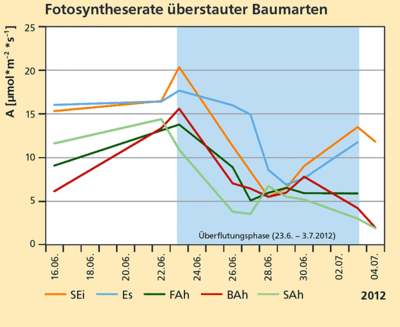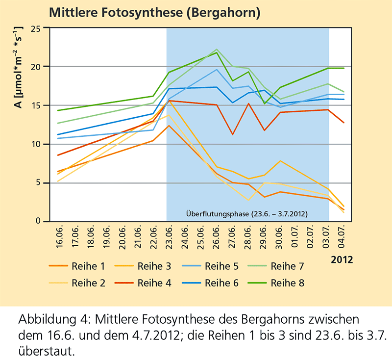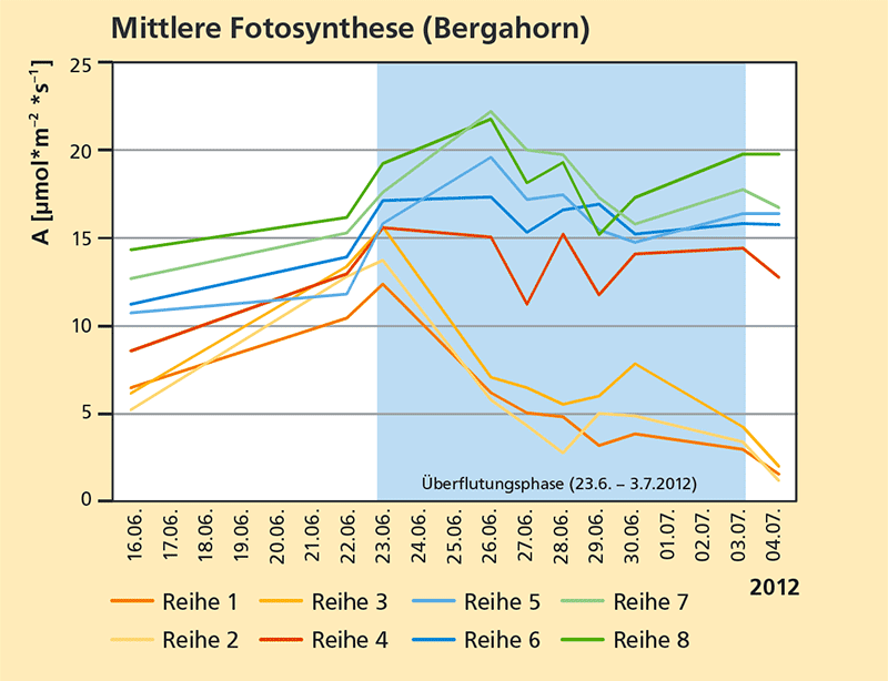 Bei der zweiten Überflutung reagierten die ersten drei Reihen (Pflanzen über den Wurzelhals geflutet) aller Baumarten mit reduzierter Photosynthese. Bei den Pflanzen mit zunehmendem Abstand zum Wasserspiegel (Reihen 4 bis 8) war die Photosyntheserate nicht reduziert.