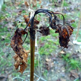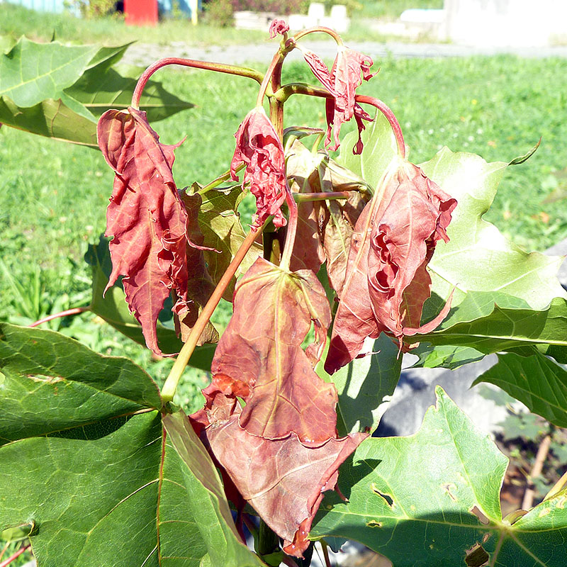 Die offensichtlichsten Symptome zeigte der Spitzahorn. Mit der ersten Überflutung sind beim ihm in den untersten zwei Reihen innerhalb von drei Tagen die jungen Triebe erschlafft. Die noch nicht ganz verholzten Triebe starben im folgenden Winter ab. Die überstauten Spitzahorne behielten im Winter ihre abgestorbenen Blätter und zeigten im Frühjahr Rindenrisse an der Stammbasis (Abb. 3a-c). Im Frühjahr waren alle überstauten Spitzahorne tot. Berg- und Feldahorn zeigten wie auch Stieleiche und Esche keine sichtbaren Symptome nach der ersten Flutung.