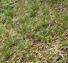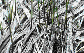 Abb. 3 - Der dichte Streufilz des Wolligen Reitgrases begräbt die Fichtenkeimlinge. Foto: Peter Brang (WSL)