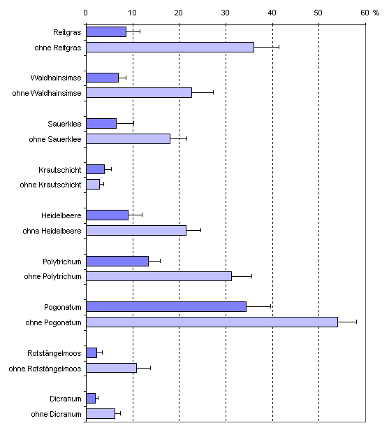 - ungünstige Wirkung: Heidelbeere mit Moospolster, Sauerklee und die Moose Dicranum scoparium, Pleurozium schreberi, Polytrichum formosum, Polytrichum alpinum