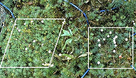 Abb. 10 - Zwei Saatstellen im Feldexperiment (weiss umrandet, Fichten mit weissen Stecknadeln markiert) nach zwei Vegetationsperioden: Links Saatstelle mit dichtem Teppich von Pogonatum urnigerum, rechts ohne. Auf der rechten Saatstelle ist das Moos bereits wieder locker nachgewachsen. Foto: Peter Brang (WSL)