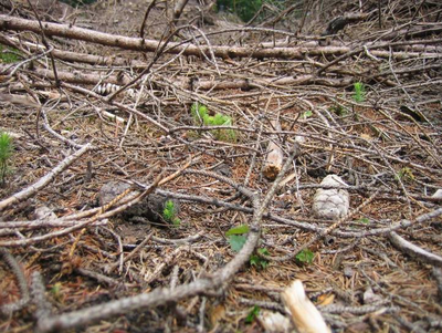 Abb. 1: Fichten- und Birken-Verjüngung im Schutz einer lockeren Reisigauflage. Foto: B. Leder