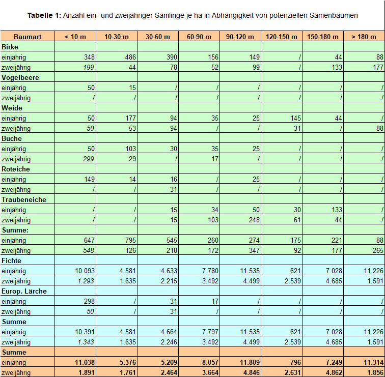 Tab. 1: Anzahl einjähriger- und zweijähriger Sämlinge je ha in Abhängigkeit potenzieller Samenbäumen.