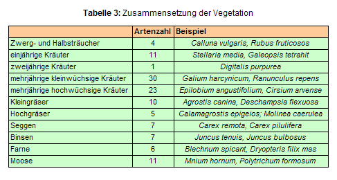 Insgesamt wurden bis zum Abschluss der zweiten Vegetationsperiode nach dem Sturmwurf auf der Versuchsfläche 115 krautige und holzige Arten kartiert (vgl. Tab. 3). Neben den mehrjährigen kleinwüchsigen und hochwüchsigen Kräutern sind einjährige Kräuter, wie Stellaria media, Galeopsis tetrahit in der Bodenvegetation mit meist nur geringem Deckungsgrad zu finden. Einige Probekreise weisen höhere Deckungsgrade (mind. 50 % der Fläche deckend) nur mit Rubus fruticosus, Polytrichum formosum und Dicranella heteromalla auf.