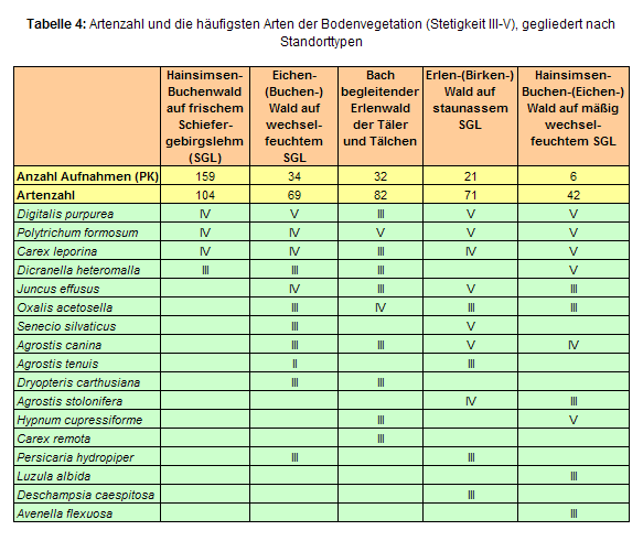 Eine Gliederung der Bodenvegetation nach den vorhandenen Standorttypen zeigt Tabelle 4. Aufgelistet, wurden lediglich die Arten, die mit hoher Stetigkeit (> 40 % der Aufnahmen) vorkommen.