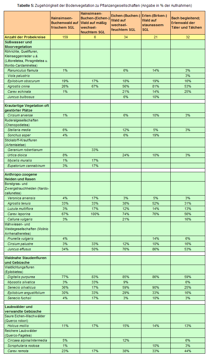 Die Zugehörigkeit kartierter Pflanzenarten der Bodenvegetation zu verschiedenen Pflanzengesellschaften (Ellenberg 1991), differenziert nach Standorttypen, zeigt Tabelle 5. Aufgeführt sind diejenigen charakteristischen Pflanzen bzw. Pflanzengesellschaften, die in mindestens 10 % der durchgeführten Aufnahmen mindestens eines Standorttyps vorhanden waren.