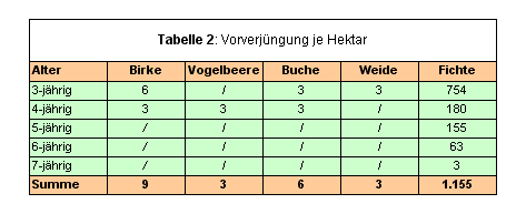 Verjüngung, die sich vor dem Sturmwurf etabliert hatte, war nur auf wenigen Teilflächen vorhanden. Als Vorverjüngung wurden Pflanzen eingestuft, die in der zweiten Vegetationsperiode nach dem Sturmwurf älter als zwei Jahre waren (Tab. 2). Die Fichte dominierte mit ca. 1.155 St./ha in der Vorverjüngung auf den Flächen. Daneben sind vereinzelt 3- bzw. 4-jährige Birken, Vogelbeeren, Weiden und Buchen vorhanden.