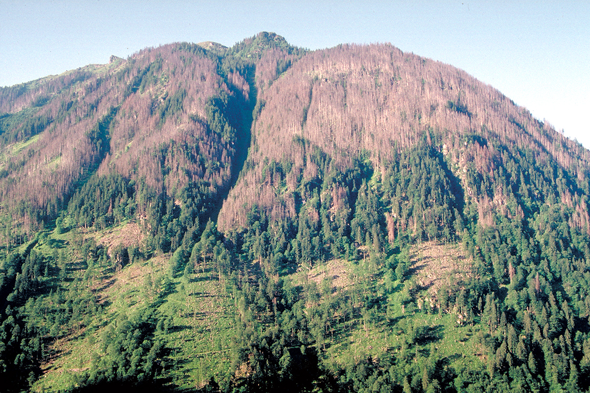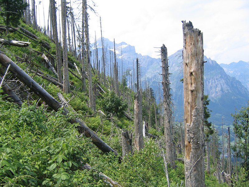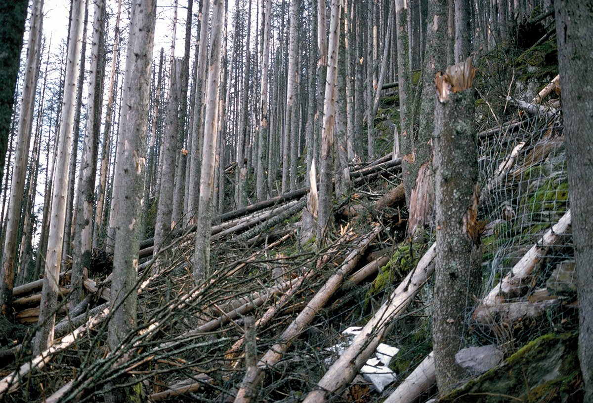 - Wie lange können stehende tote Bäume, Strünke und liegende Stämme in steilen Gebirgslagen das Anreissen von Waldlawinen verhindern und Steinschläge abbremsen?