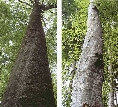 Ein wichtiges Qualitätsmerkmal ist der Drehwuchs. Darunter versteht man die Abweichung des Faserverlaufs von der Parallelität zur Stammachse, das heißt die Holzfasern sind spiralförmig um die Stammachse gewachsen. Äußerlich ist der Drehwuchs bei relativ alten Buchen leicht erkennbar (Abbildung 1).