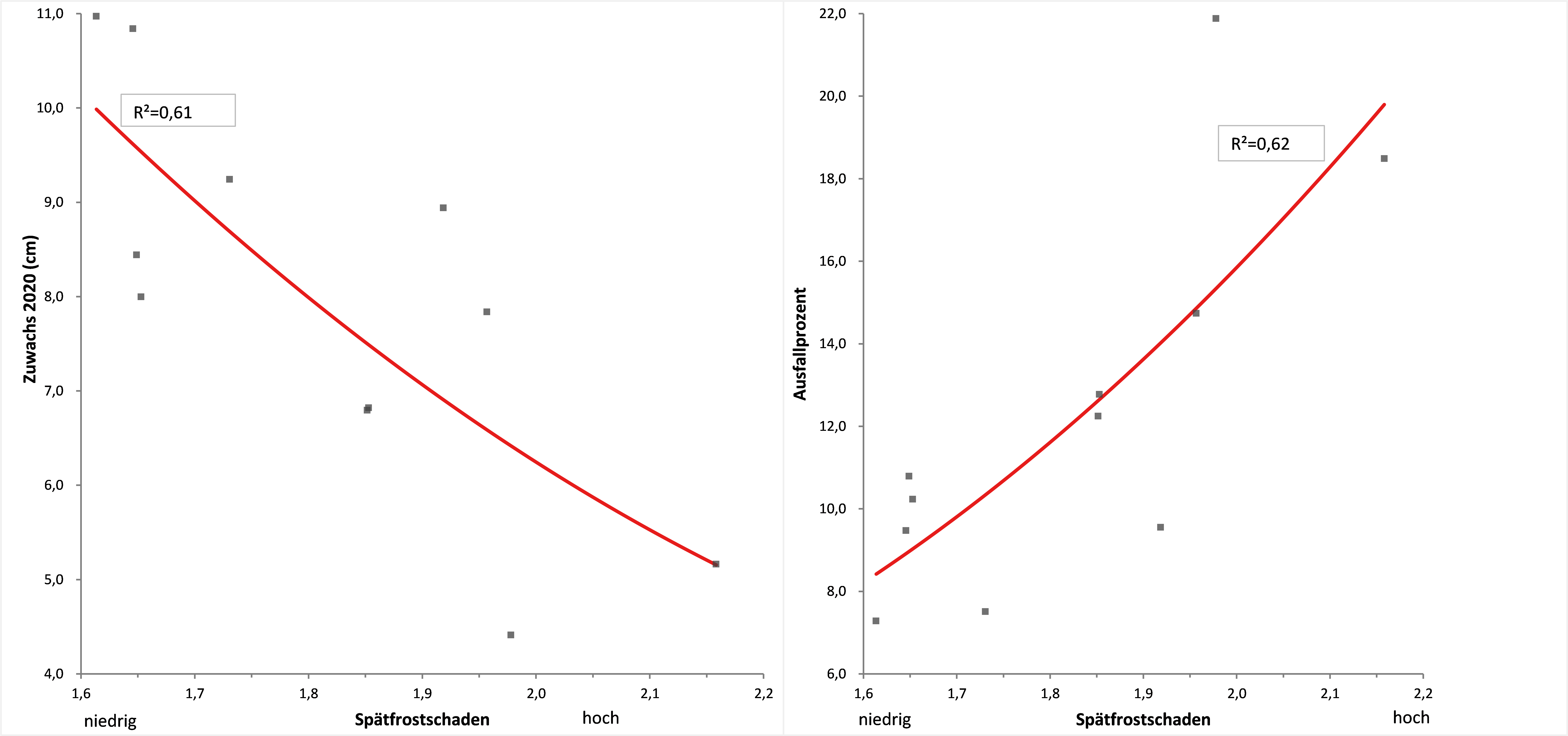 Spätfrostschäden führen zu Vitalitätseinbußen, Verbuschung, Zwieselbildung und Zuwachsverlusten. Sie erhöhen das Risiko von Ausfällen. Es war ein Zusammenhang zwischen Intensität der Spätfrostschäden und erhöhten Ausfällen nachweisbar (Abb. 8). Der Einfluss des Spätfrosts auf den Zuwachs war deutlich erkennbar: Gering frostgeschädigte Pflanzen hatten längere Leittriebe bzw. höhere Zuwächse. Rumänische Herkünfte, die nicht vom Frost betroffen waren, wiesen mittlere Jahreszuwächse von über 10 cm auf, während stark geschädigte Herkünfte nur 5 cm erreichten. Ein Zusammenhang zwischen Pflanzengröße und Spätfrostschäden war nicht nachweisbar.
