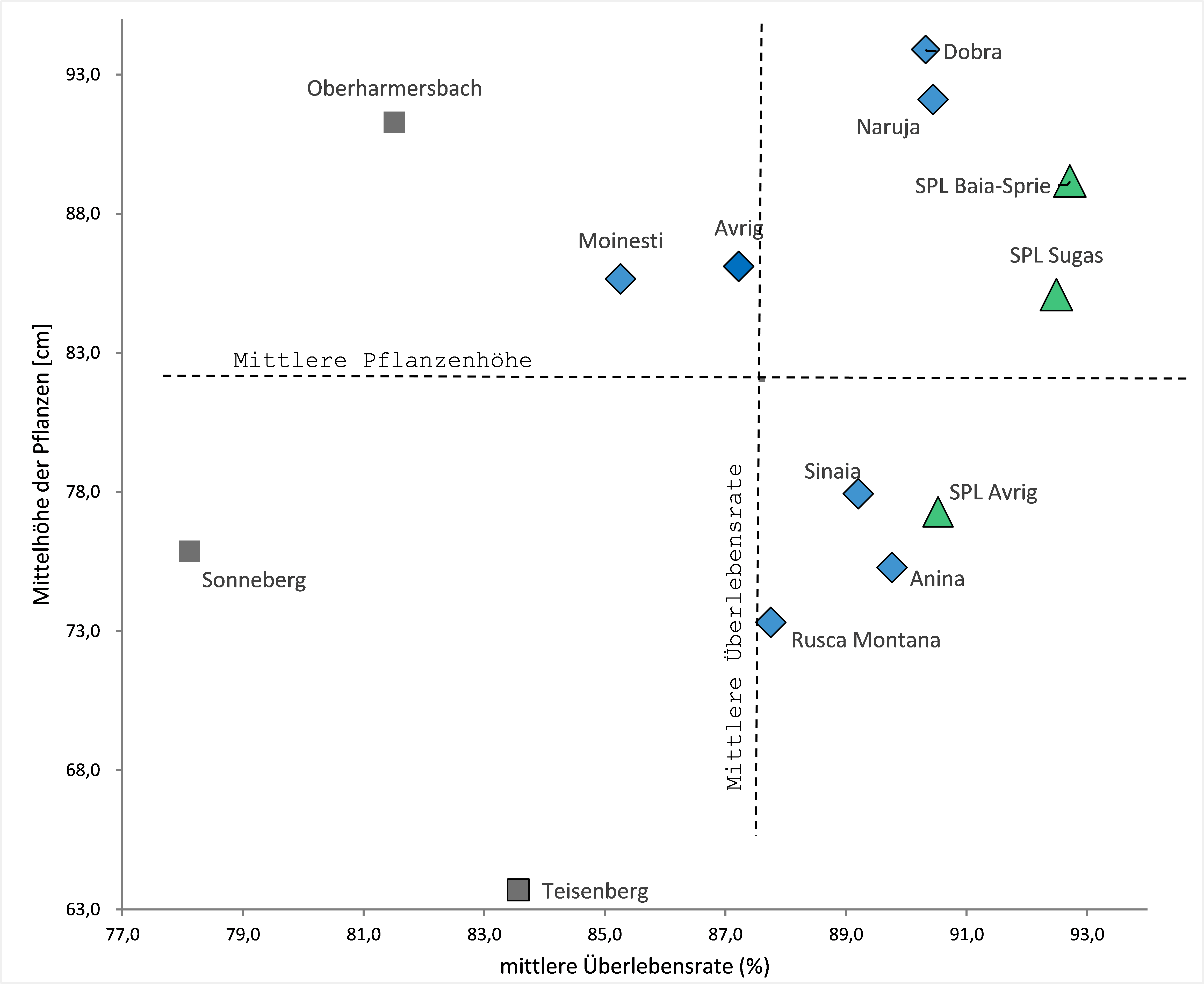 Die Pflanzenhöhe der Bestandesabsaat Dobra sowie der Samenplantagen Baia-Sprie und Avrig lag sowohl auf dem trocken-wärmsten Standort Breitefenn als auch auf dem feucht-kühlsten Versuch Höfen über dem jeweiligen Flächenmittel.