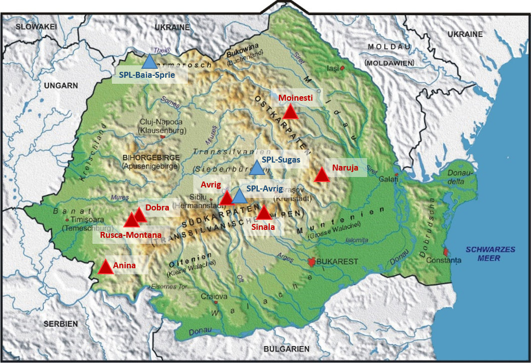 Abb. 2: Lage der verwendeten Bestände und Samenplantagen (SPL) in Rumänien (Karte: Crux, ROMANIA Fizic, CC BY-SA 3.0)