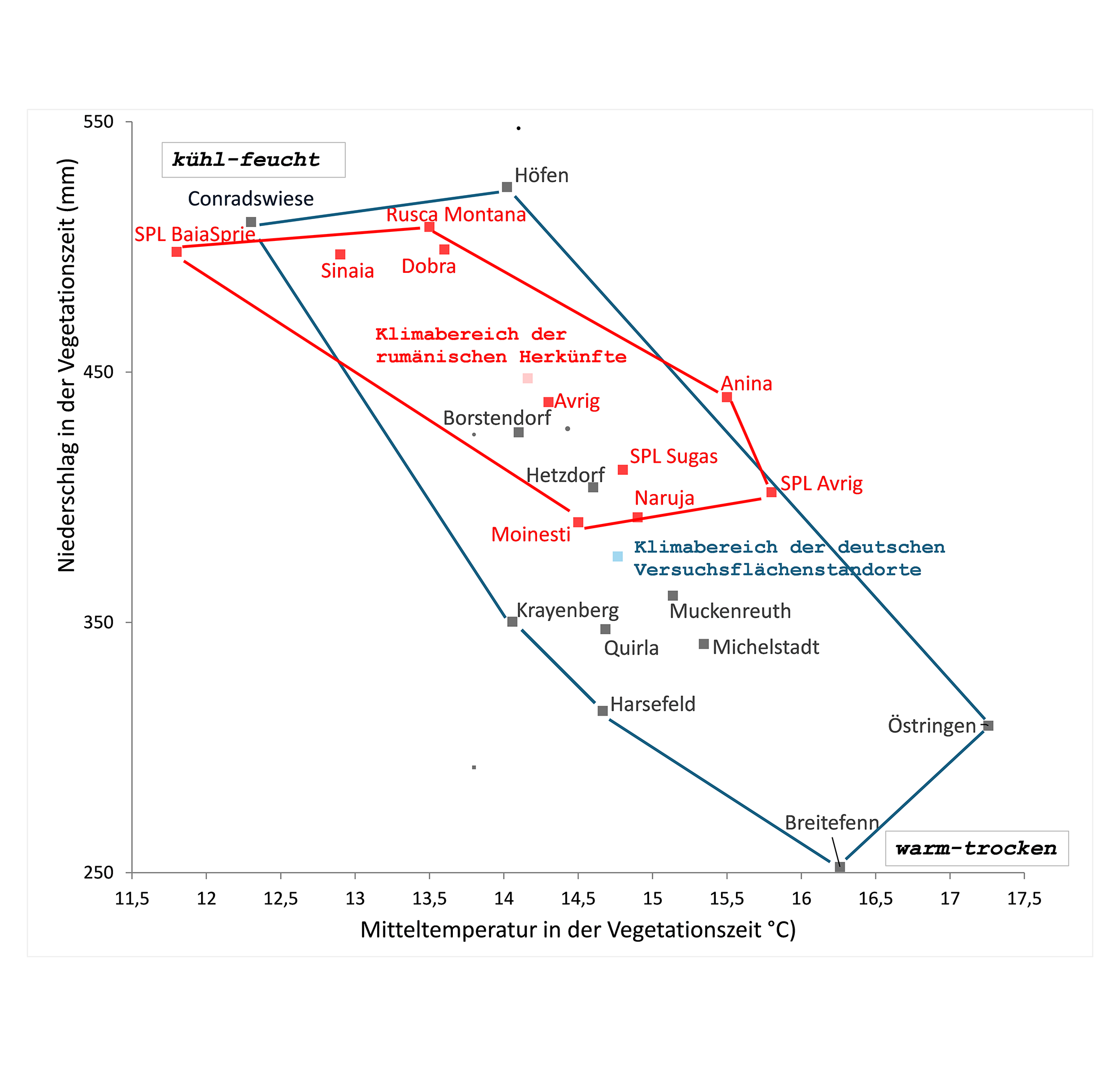 Die besten rumänischen Bestandesherkünfte kommen aus Gebirgsregionen mit ausreichend Jahresniederschlag und einem Niederschlagsmaximum im Sommer. Ihrer Anpassungsfähigkeit an steigende Temperaturen und zunehmende Sommertrockenheit muss deshalb in den kommenden Jahren speziell auf der niederschlagsärmsten Versuchsfläche Breitefenn (Brandenburg) besondere Aufmerksamkeit zukommen.