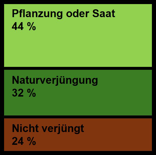 Bis zum Zeitpunkt der Befragung waren bereits 76% der betrachteten Schadflächen mit Wiederbewaldungsbedarf in Baden-Württemberg wieder bestockt, wovon 44% auf die Verjüngungsart Pflanzung oder Saat und 32% auf die Naturverjüngung entfallen (Abb. 2). Zusammengefasst sind 37% der wiederbewaldeten Schadfläche nach Einschätzung der Revierleitenden bereits gesichert verjüngt. Zudem wurden 65% der bereits wiederbewaldeten Schadfläche als zielgerecht bewertet, während sich 35% der Flächen nach den Einschätzungen der Befragten häufig aufgrund der Übernahme von bereits etablierter, nicht zielgerechter Naturverjüngung und Wildverbiss/-schäden, nicht entsprechend den Zielen entwickeln. Insgesamt 24% der betrachteten Flächen waren bis zum Zeitpunkt der Befragung noch nicht verjüngt.