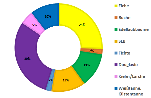 Die Löwenanteile der Kunstverjüngung nehmen die Baumarten Eiche und Douglasie ein, gefolgt von Edellaubbäumen und den “sonstigen Laubbäumen”, die beispielsweise Erle, Linde, Birke und Esskastanie umfassen, sowie die “sonstigen Nadelbäume”, die Weißtanne, Küstentanne und Zedern beinhalten.