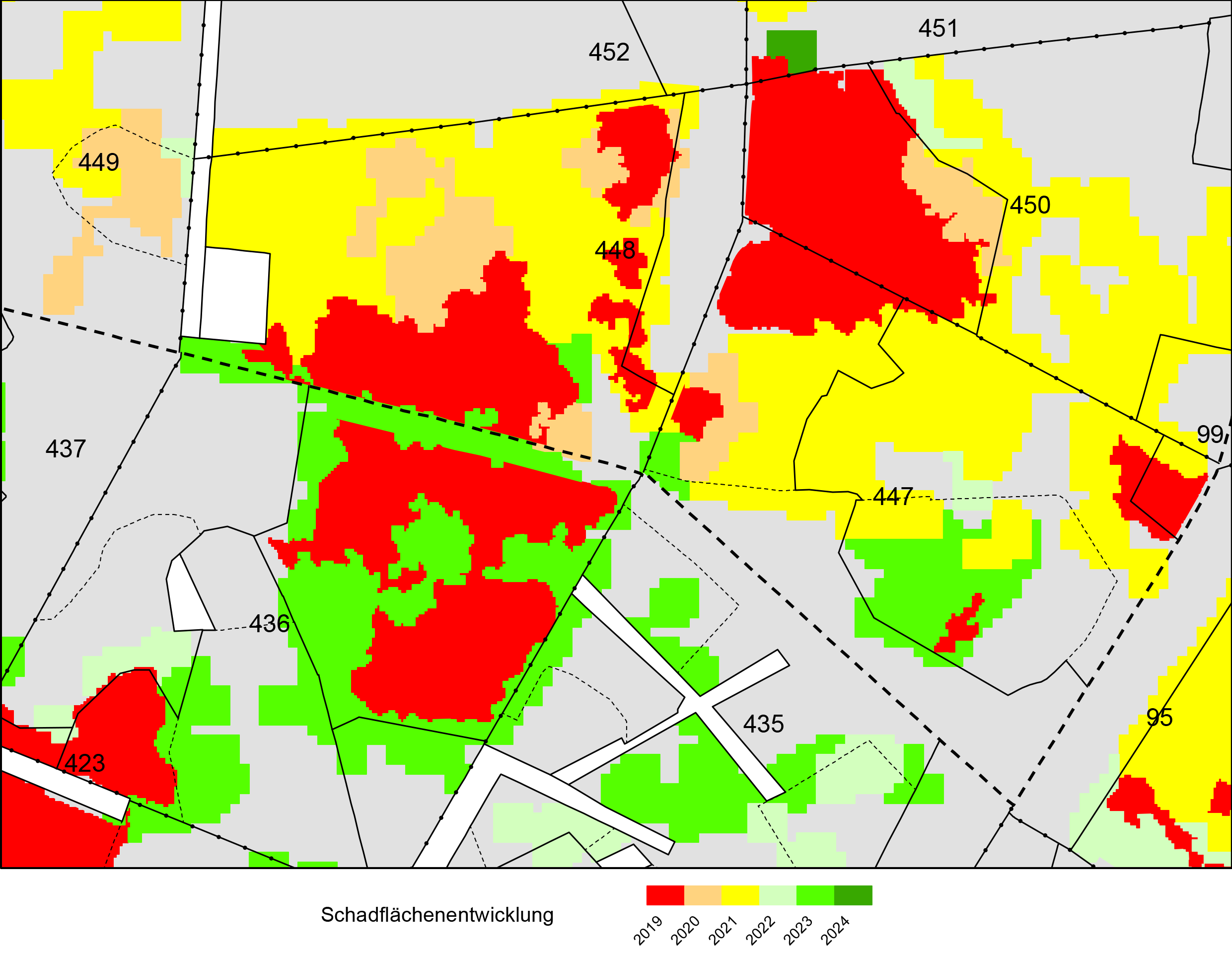 Die Neuentstehung von Schadflächen ist seit 2023 rückläufig. Aufgrund jahreszeitlicher Wolkenabdeckungen war eine satellitengestützte Auswertung seither nur eingeschränkt möglich.