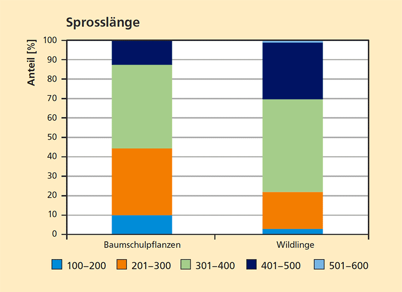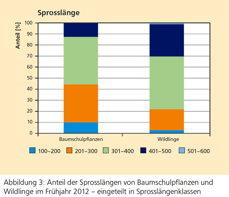 Unterteilt man die Sprosslängen 2012 nach Sprosslängenklassen (Abb. 3), wird ersichtlich, dass bereits über 30 Prozent der Wildlinge höher als vier Meter sind. Bei den Baumschulpflanzen beträgt dieser Anteil lediglich zwölf Prozent. Bei den Wildlingen besitzen nur noch drei Prozent eine Höhe von unter zwei Metern, bei den Baumschulpflanzen sind es immer noch zehn Prozent.