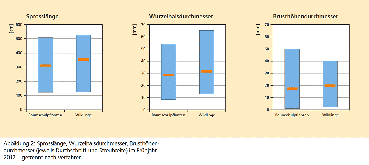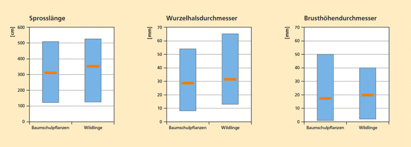 In der Wuchsleistung bauen die Wildlinge gegenüber den Baumschulpflanzen ihren Vorsprung kontinuierlich aus. 2012 beträgt die Differenz der durchschnittlichen Sprosslänge über 40 Zentimeter (Tab. 1, Abb. 2). Auch der durchschnittliche Wurzelhalsdurchmesser sowie der durchschnittliche Brusthöhendurchmesser liegen jeweils etwa drei Millimeter höher als bei den Baumschulpflanzen (Tab. 2, Abb. 2).
