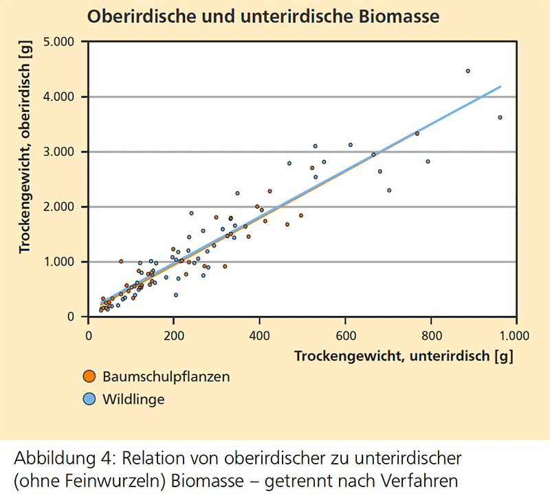Um die Verfahren abschließend beurteilen zu können, wurden im Herbst 2012 die Wurzeln samt oberirdischer Biomasse von 43 Baumschulpflanzen und 49 Wildlingen mit einem Bagger ausgegraben; das entspricht einem Anteil von jeweils knapp 15 Prozent aller noch verbliebenen Pflanzen (Tab. 2).
